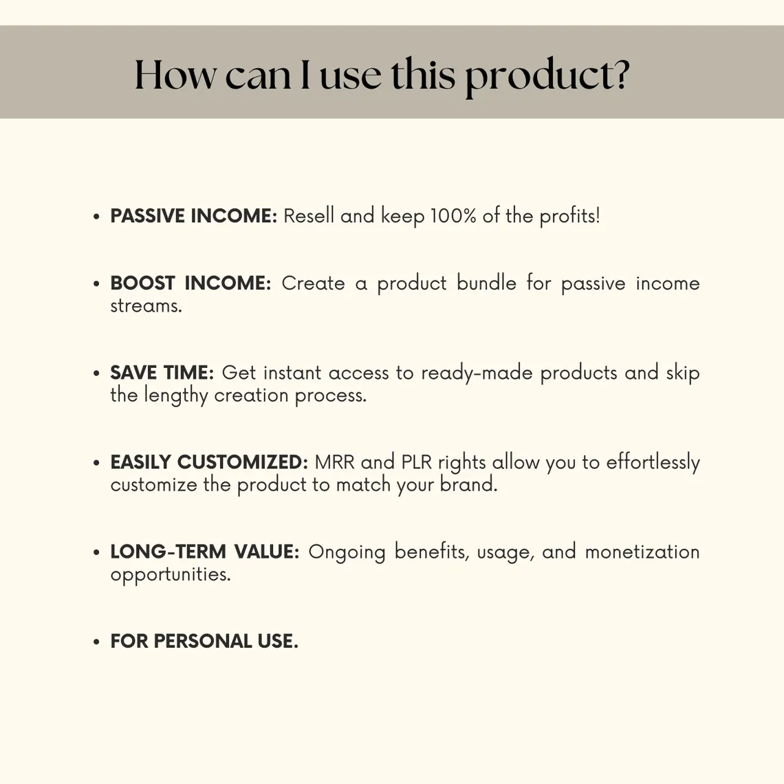 This bundle includes digital products that you can customize, rebrand, and resell. Instead of creating content from zero, you can start selling immediately and build your digital product store, online marketplace, or passive income system efficiently.